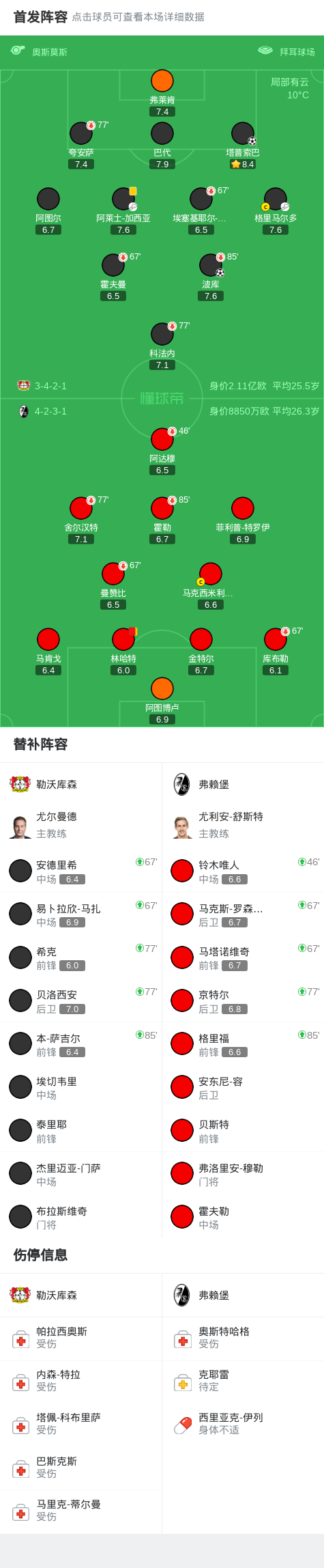 北京時間10月26日,德甲聯賽第8輪繼續進行,勒沃庫森在主場迎戰弗賴堡。上半場,阿萊士-加西亞送出精準直塞,波庫抓住機會在弧頂位置兜射破門,為主隊先下一城。隨后,格里馬爾多送出妙傳,塔普索巴頭球建功,將比分擴大至2比0。下半場,弗賴堡球員林哈特因累積兩張黃牌被罰下,球隊進攻陷入困境。最終,勒沃庫森以2比0戰勝對手,全取三分。